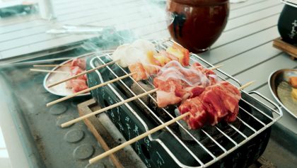 Japanese inspired beef yakitori on my tiny bbq grills at home.